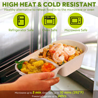 Our 2 compartments compostable food containers are great to serve hot or cold to go lunches. It is a perfect disposable bento box with 2 compartments to take homemade lunch with side at work or school. This biodegradable take out food containers makes great choice for daily lunch or any other meal at restaurants to go orders, food trucks, parties at work or home or even for outdoor picnic.